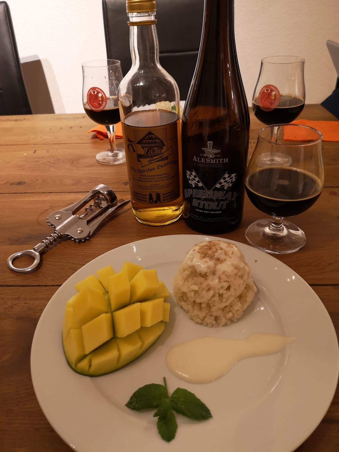 Sauce für den Reis - 375ml Kokosmilch, 200g Rohzucker, 1 Vanilleschote und 2.5TL Salz in einer Pfanne aufkochen. Vom Herd nehmen und mit dem fertig gedämpften, noch heissen Reis vermengen. Das ganze Stehen lassen (darf abkühlen und kann bis hier gut im Voraus vorbereitet werden).
